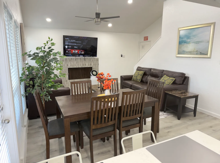 Experience this beautifully newly renovated three-bedroom, two-bathroom duplex, thoughtfully designed to offer comfort, convenience, and a welcoming atmosphere for both business and leisure travelers. The property features modern amenities and is ideally situated near major attractions, including AT&T Stadium, Six Flags, UT Arlington, Lake Arlington, and Globe Life Field, home of the Texas Rangers. Additionally, it is centrally located within proximity to numerous bars and restaurants. This 3-bedroom, 2-bath vacation home offers a secure, quiet setting with a patio for relaxing or grilling. Inside, you’ll find a fully equipped kitchen, laundry room, dining area, and family room with a 65″ Smart TV. The master suite features a king bed, beauty sleep mattress, 55″ Smart TV, and en-suite bath. The second bedroom have 2 queen beds and Smart TV; the third a king bed with memory foam mattresses and another Smart TV. Ideal for families and groups, this home provides comfort and entertainment after work or sightseeing. This fully furnished townhome features 3 bedrooms, 2 bathrooms, 4 beds, and a master suite downstairs. Enjoy a private entrance, fenced yard, patio, and charcoal BBQ. Utilities are included in rent, and pets are welcome. Perfect for vacation stays, business travel, or temporary housing during moves or renovations.