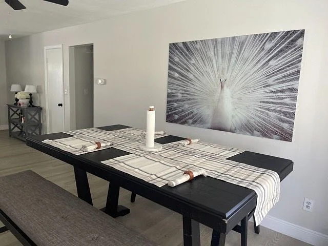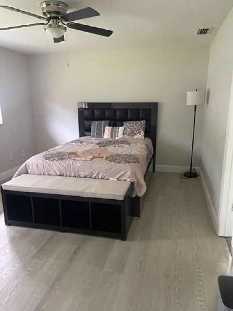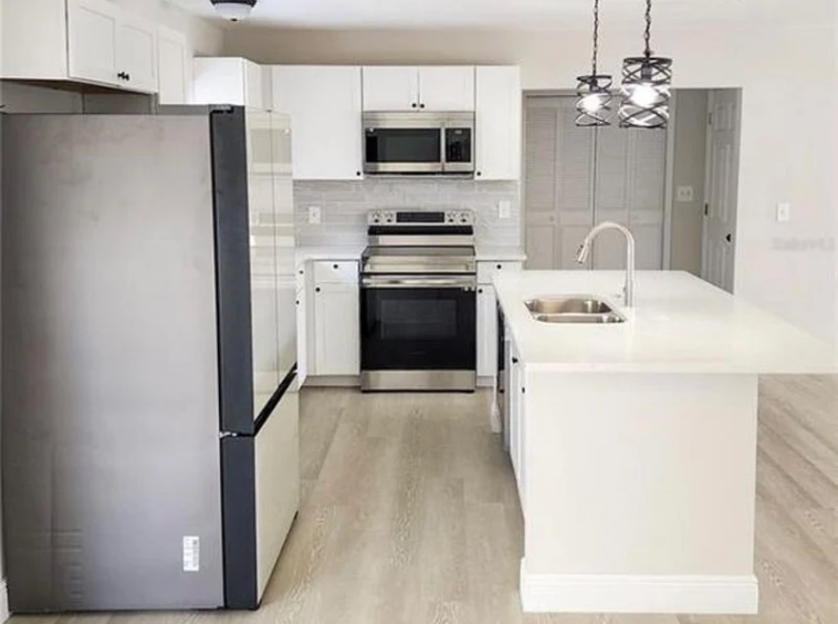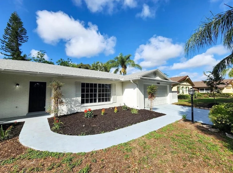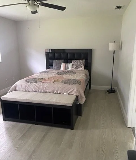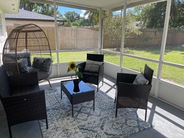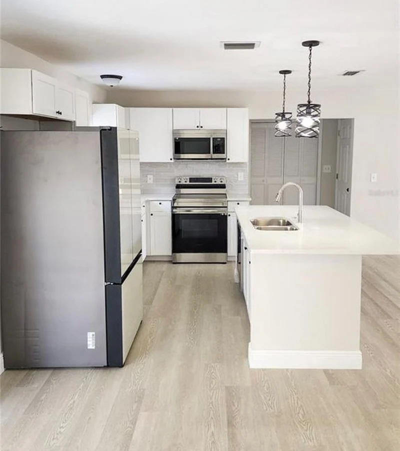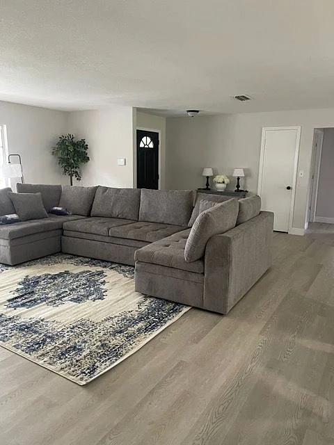 You can also enjoy the fantastic outdoor space that this property has to offer. Step out onto the porch and relax while enjoying the fresh air. The backyard is adorned with beautiful mango trees and a lovely garden, providing a serene environment. Inside the house, the living room is thoughtfully furnished with a comfortable sectional sofa, a TV stand, and a TV. It also features a cozy loveseat, perfect for unwinding after a long day. The vinyl plank flooring adds a touch of elegance to the overall decor.