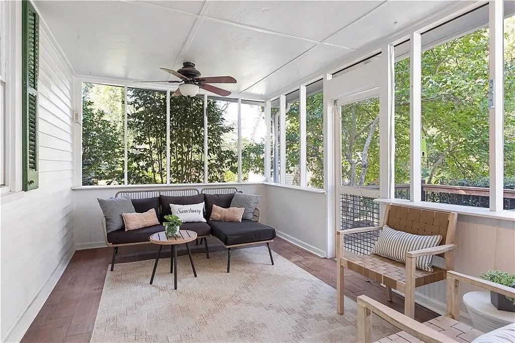 The main level features a formal living room with built-in bookshelves, a dining room with a glass-front whiskey cabinet, a sunroom for quiet reflection, and a screened-in back porch perfect for outdoor living. Original pocket doors enhance the flow between spaces while maintaining each room’s character.