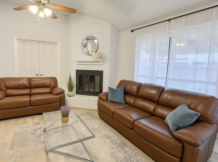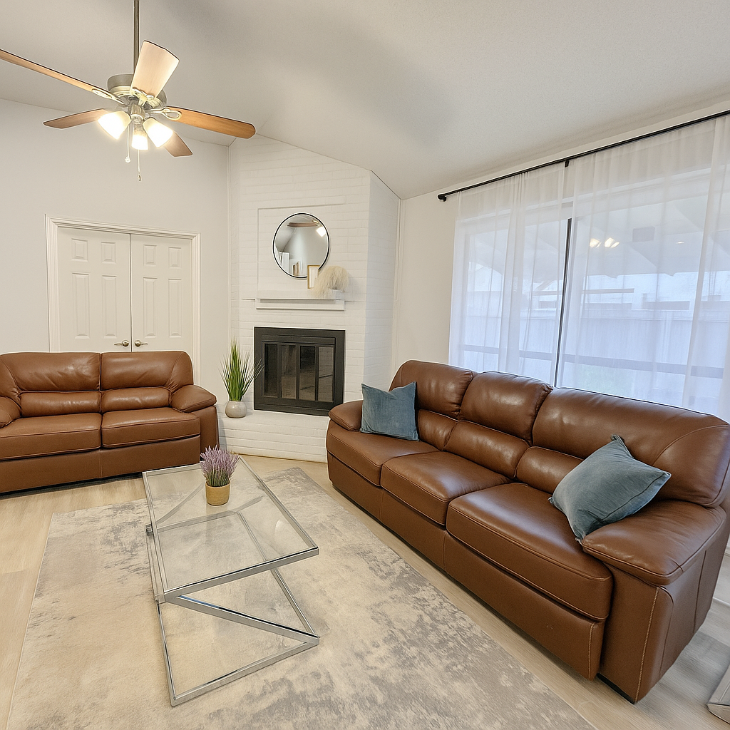 Step inside to find a thoughtfully designed interior featuring a spacious open-concept layout, complete with stylish furnishings and modern décor. The living area is warm and inviting, with plush seating, a large flat-screen TV, and abundant natural light—perfect for relaxing or entertaining guests.